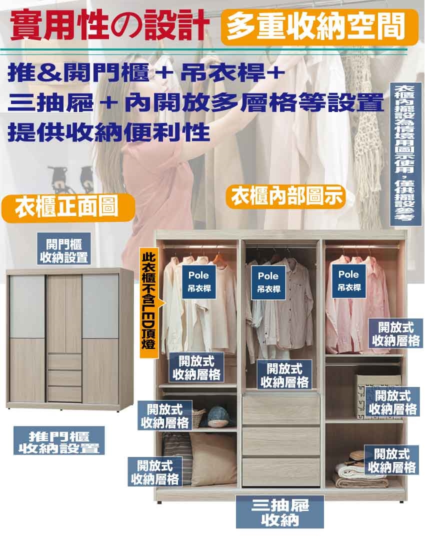 搭配採用開門櫃&推門櫃+吊衣桿+三抽屜+內開放多層格等收納空間設計