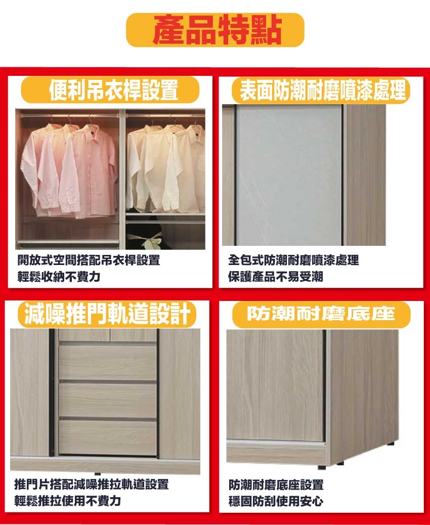 採用防蛀木心板+防潮耐磨底座+耐磨美耐皿(淺色面板)+五金滑軌結構等安心材質製造