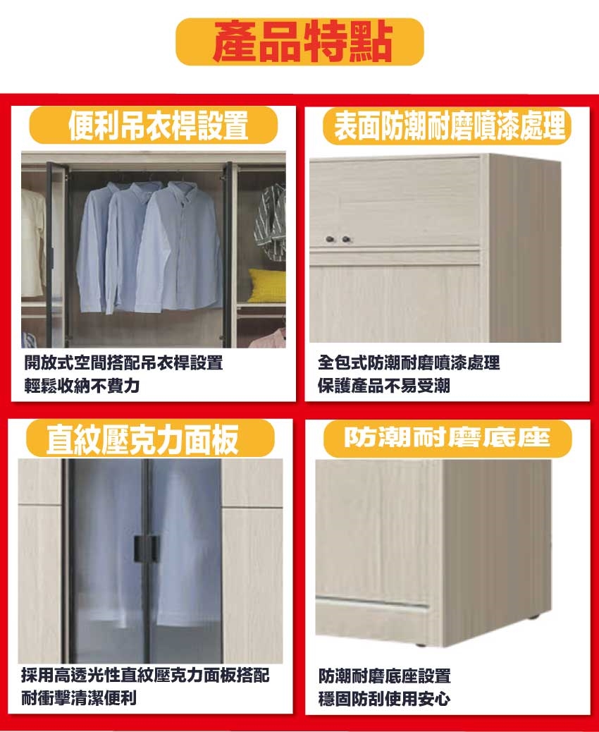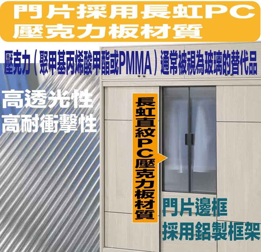 材質:防蛀木心板+防潮耐磨腳座+五金滑軌結構+長虹直紋PC壓克力板+防夾手緩衝五金