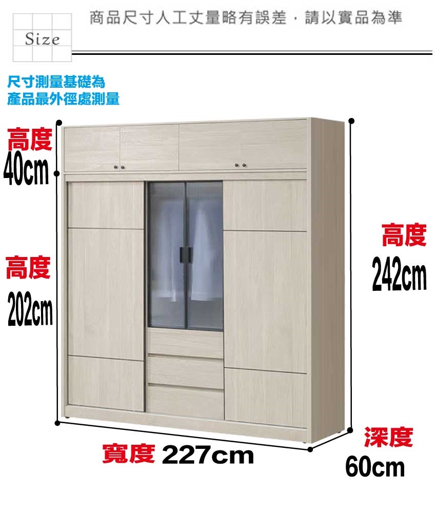 - ◆產品名稱: 【綠家居】夏斯7.6尺開&推門加高衣櫃組合