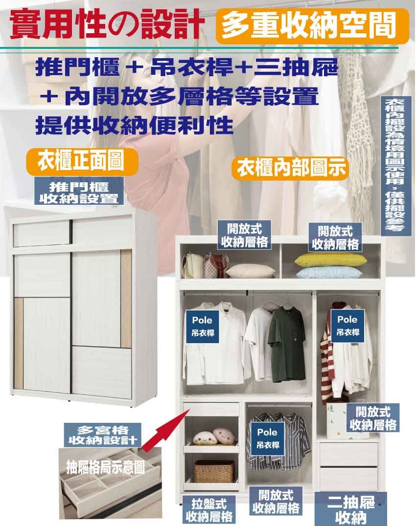 搭配採用推門櫃+吊衣桿+三抽屜(含多宮格收納抽)+內開放多層格等收納空間設計