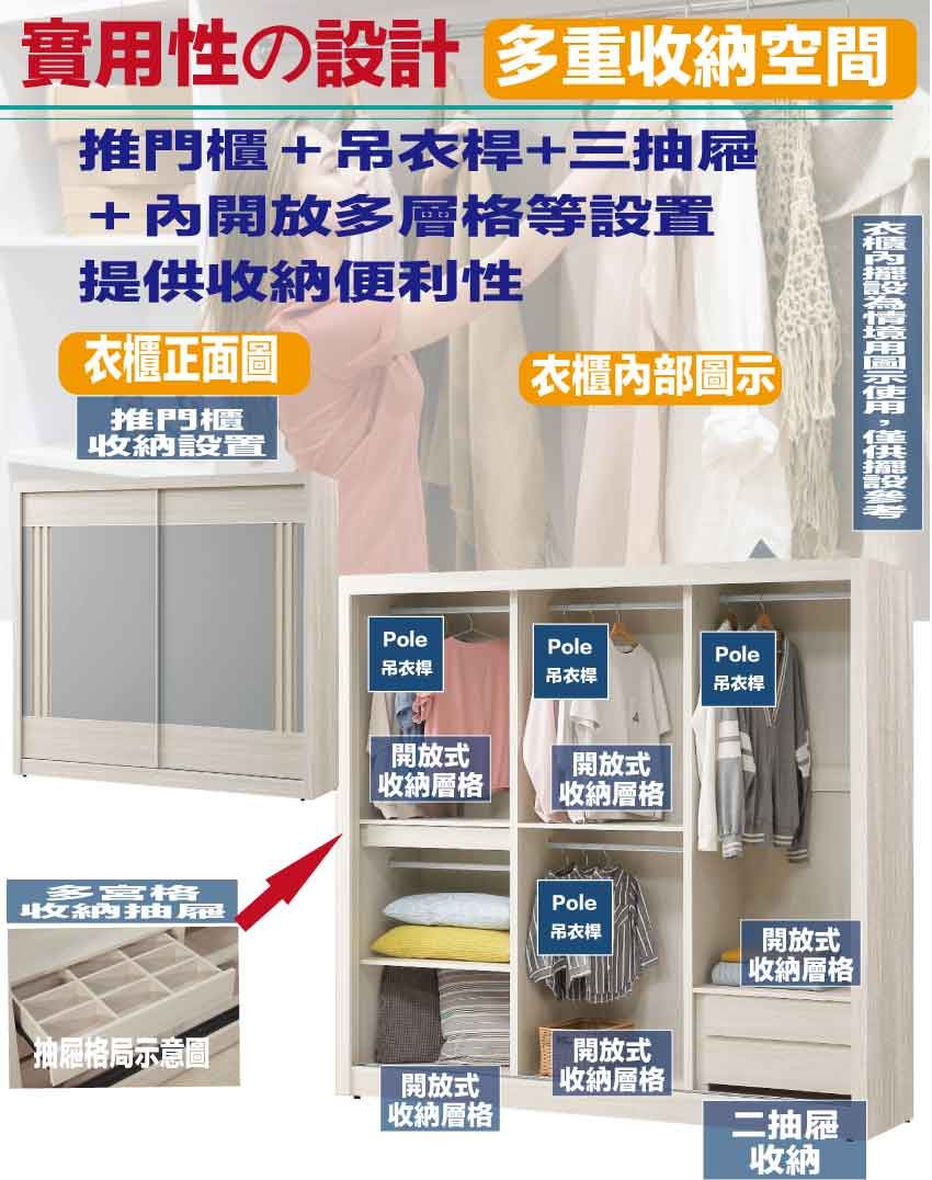 搭配採用推門櫃+吊衣桿+三抽屜(含多宮格收納抽)+內開放多層格等收納空間設計