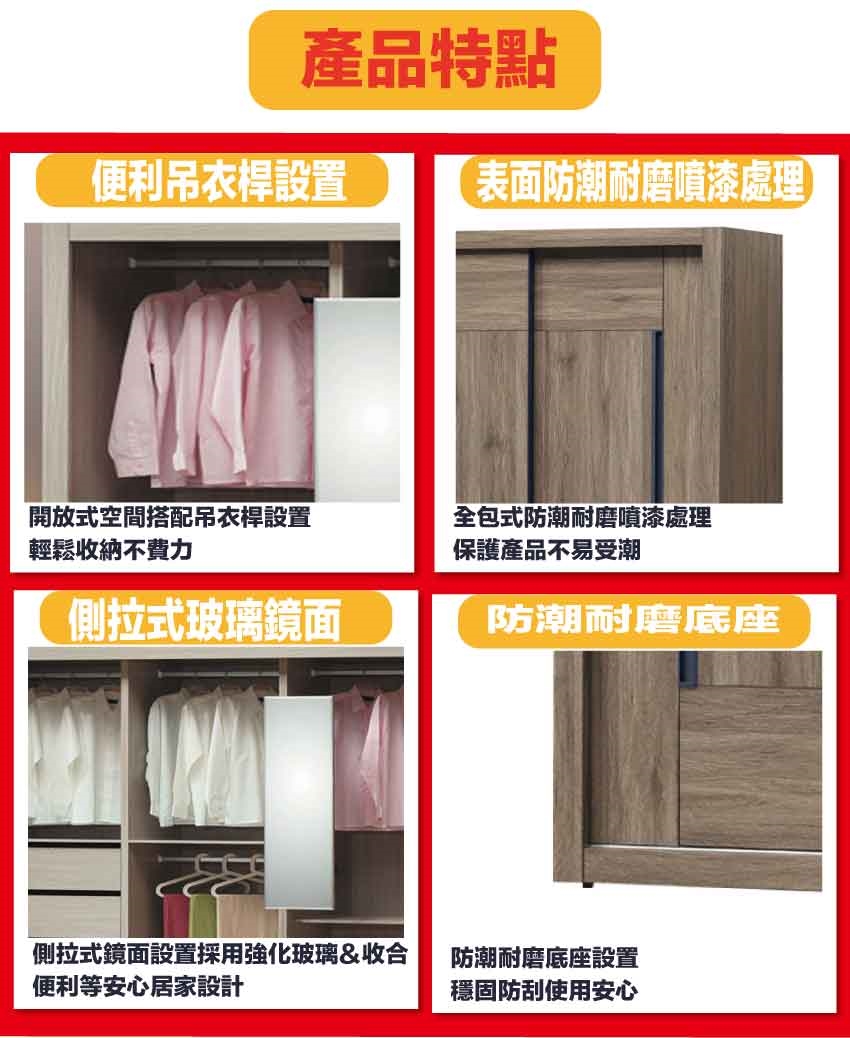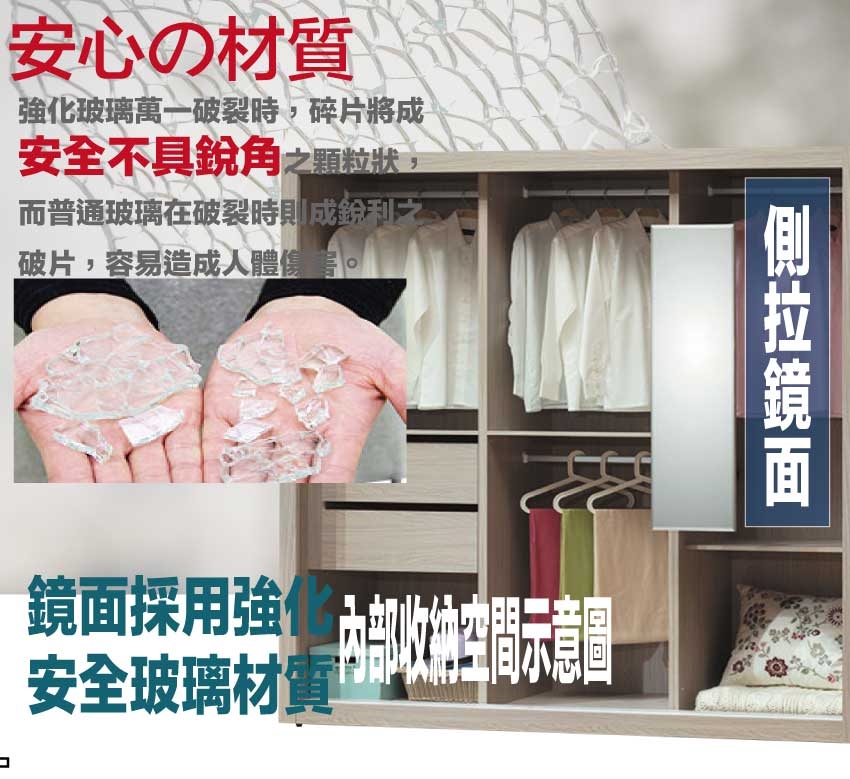 採用防蛀木心板+防潮耐磨底座+五金滑軌結構+強化玻璃鏡面內+含側拉穿衣鏡面等安心材質製造