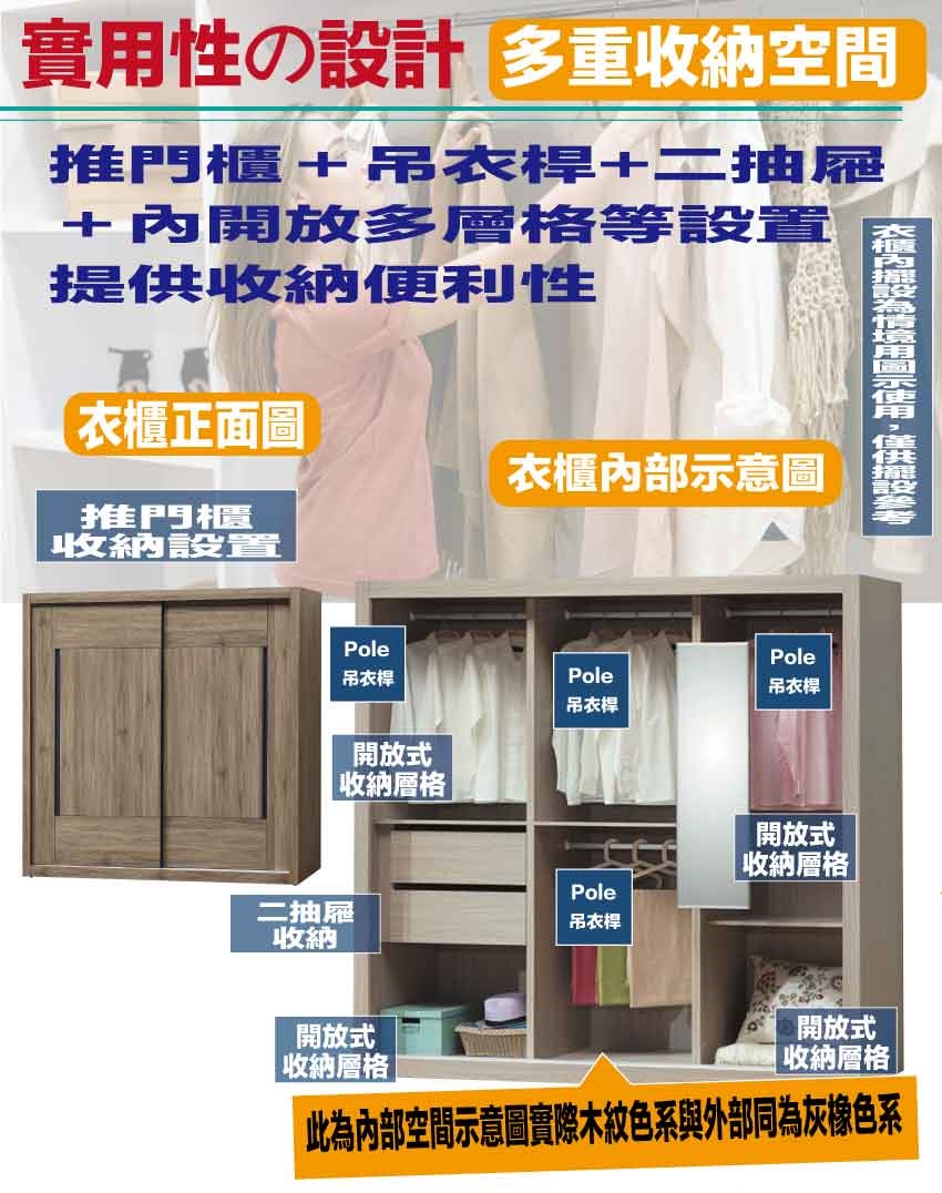 搭配採用推門櫃+吊衣桿+二抽屜+內開放層格等收納空間設計
