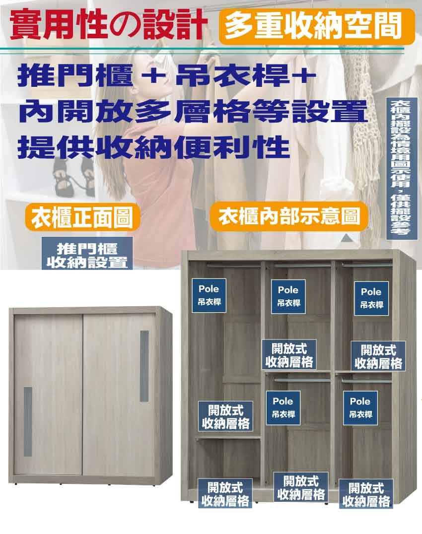 搭配採用推門櫃+吊衣桿+內開放層格等收納空間設計
