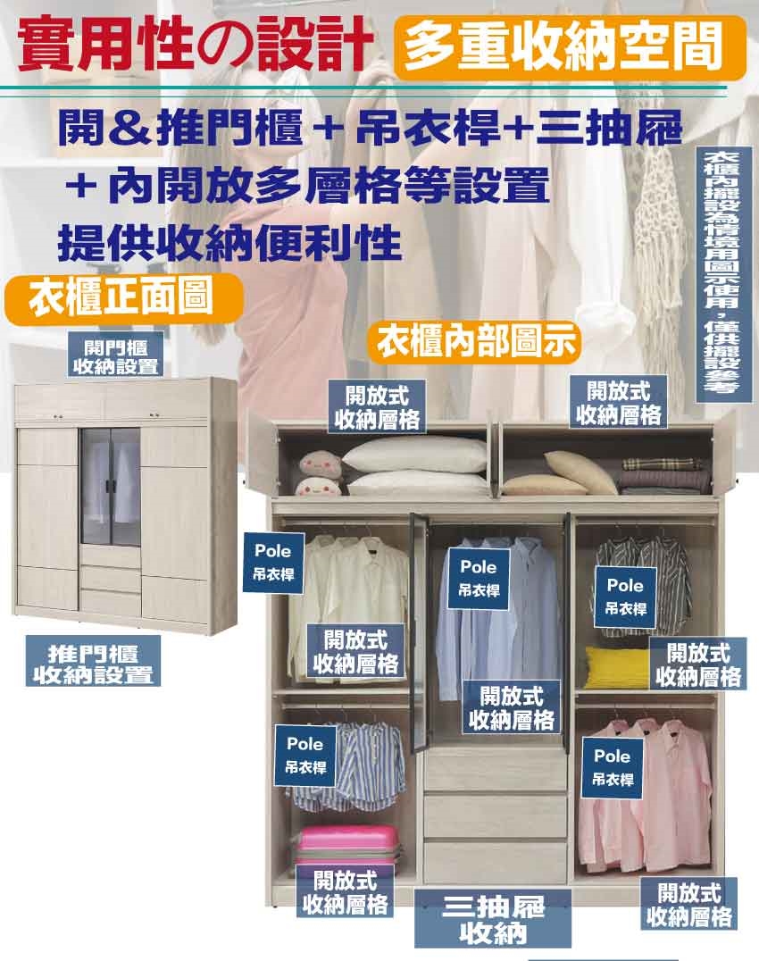 採用開門櫃+推門櫃+吊衣桿+三抽屜+內開放層格等收納空間設計