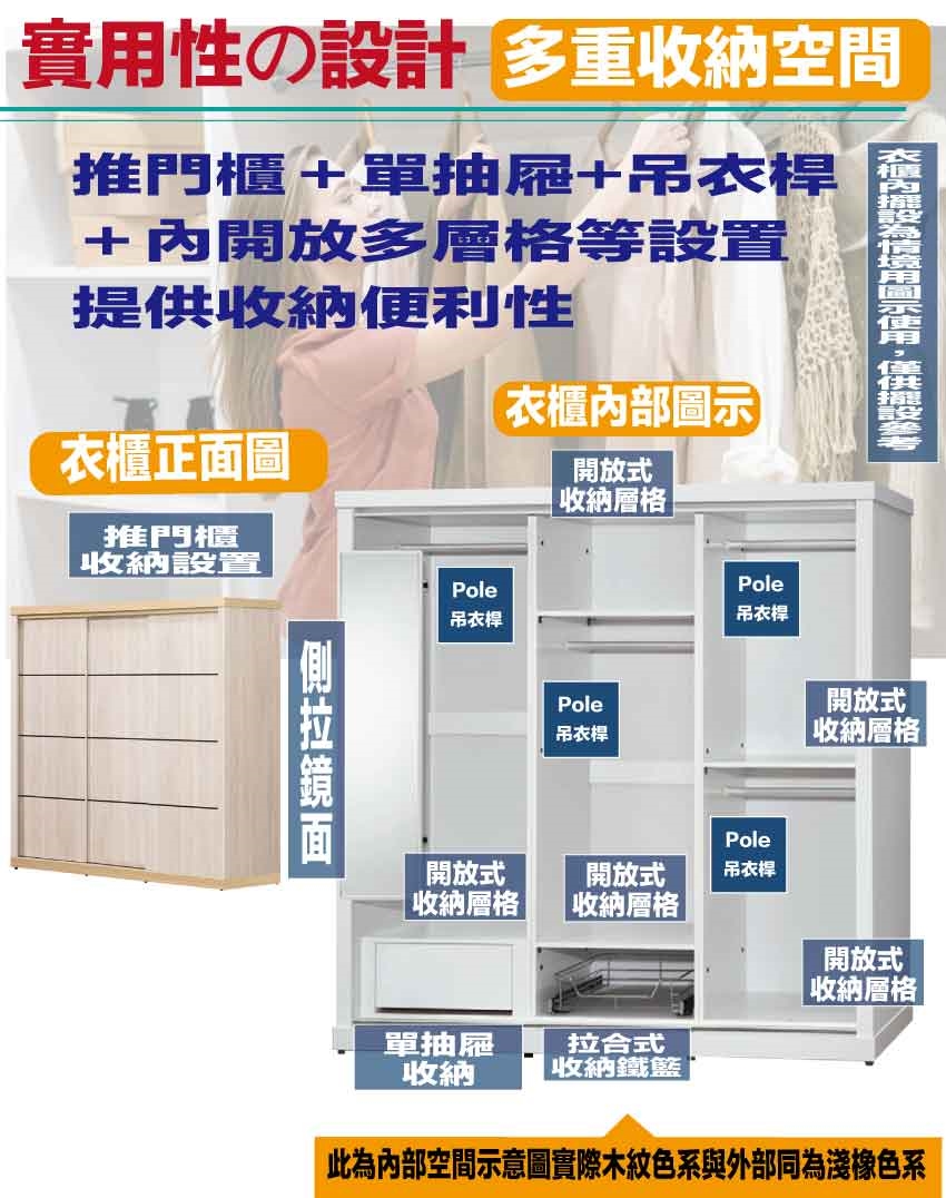 採用推門櫃+吊衣桿+單抽屜+拉合收納鐵籃+側拉穿衣鏡面+內開放層格等收納空間設計