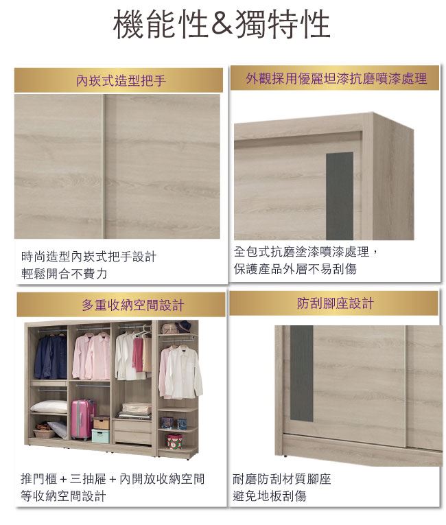 商品介紹 | 【綠家居】額爾 現代8.6尺推門衣櫃/收納櫃組合 白橡木紋色+現代簡約風格+安心材質製造,整體採用防蛀木心板+防刮耐磨腳座+五金滑軌結構等安心材質製造,外層採用優利坦全包式耐磨噴漆處理搭配開門櫃+吊衣桿+三抽屜(含多宮格收納抽屜)+內開放式收納等收納設計,全由專人配送到家,專業安心服務,替你省下更多時間! 【商品特色】 白橡木紋色+現代簡約風格+安心材質製造,使用放心+搭配居家更便利 採用防蛀木心板+防刮耐磨腳座+五金滑軌結構等安心材質製造 開門櫃+吊衣桿+三抽屜(含多宮格收納抽屜)+內開放式收納等收納設計 此商品不需要DIY組立,此商品為組立後之成品 品質保證、專業設計、貼心服務 全由專人配送到家,專業安心服務,替您省下更多時間 |