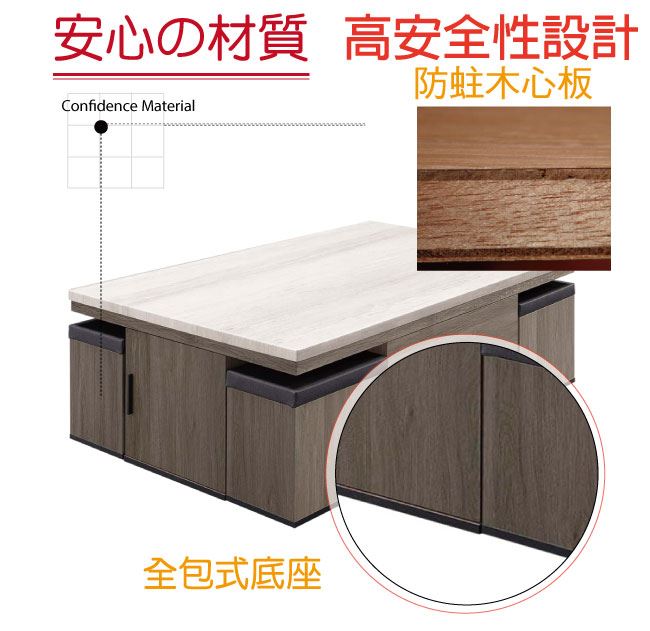 商 品 介 紹 | 【綠家居】艾金森5尺四抽木製大茶几(仿雲紋石面木質桌面板+內附小椅凳四張) 灰橡木紋色系+現代簡約風格+安心材質製造,整體採用防蛀木心板+全包式底座+五金滑軌結構+2cm仿雲紋石面木質桌面板等安心材質製造,產品外層採用防潮耐磨噴漆處理搭配採用雙面開合四抽屜+內&外開放式收納+內附小椅凳四張等空間設計,全由專人配送到家,專業安心服務,替你省下更多時間! 【商品特色】 灰橡木紋色系+現代簡約風格+安心材質製造,使用放心+搭配居家更便利 採用防蛀木心板+全包式底座+五金滑軌結構+2cm仿雲紋石面木質桌面板等安心材質製造 產品外層採用防潮耐磨噴漆處理 搭配採用雙面開合四抽屜+內&外開放式收納+內附小椅凳四張等空間設計 此商品不需要DIY組立,此商品為組立後之成品 全由專人配送到家,專業安心服務,替您省下更多時間