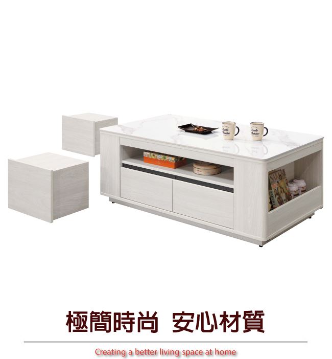 商 品 介 紹 | 【綠家居】魁北克4.3尺二抽多功能大茶几(附收納椅凳二張) 淺橡木紋色系+現代簡約風格+安心材質製造,整體採用防蛀木心板+防潮耐磨腳座+五金滑軌結構+12mm高硬度岩板等安心材質製造,產品外層採用防潮耐磨噴漆處理搭配採用二抽屜+側掀櫃+開放式收納等收納空間設計,全由專人配送到家,專業安心服務,替你省下更多時間! 【商品特色】 淺橡木紋色系+現代簡約風格+安心材質製造,使用放心+搭配居家更便利 採用防蛀木心板+防潮耐磨腳座+五金滑軌結構+12mm高硬度岩板等安心材質製造 產品外層採用防潮耐磨噴漆處理 搭配採用二抽屜+側掀櫃+開放式收納等收納空間設計 此商品不需要DIY組立,此商品為組立後之成品 品質保證、專業設計、貼心服務 全由專人配送到家,專業安心服務,替您省下更多時間
