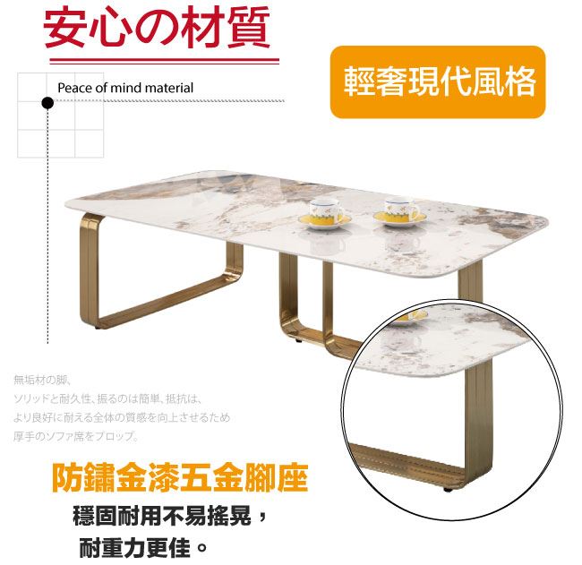材質 | ◆產品名稱:【綠家居】馬拉博4.7尺岩板大茶几 尺寸:(寬)140x(深)72(高)39公分 ◆材質: 材質:防鏽金漆五金腳座+12mm高硬度岩板