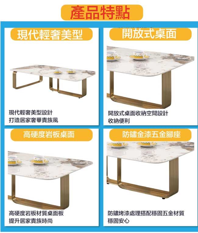 商 品 介 紹 | 【綠家居】馬拉博4.7尺岩板大茶几 奢華雙色系+現代簡約風格+安心材質製造,整體採用防鏽金漆五金腳座+12mm高硬度岩板等安心材質製造,搭配採用開放式收納收納空間設計,全由專人配送到家,專業安心服務,替你省下更多時間! 【商品特色】 奢華雙色系+現代簡約風格+安心材質製造,使用放心+搭配居家更便利 採用防鏽金漆五金腳座+12mm高硬度岩板等安心材質製造 搭配採用開放式收納收納空間設計 此商品不需要DIY組立,此商品為組立後之成品 品質保證、專業設計、貼心服務 全由專人配送到家,專業安心服務,替您省下更多時間