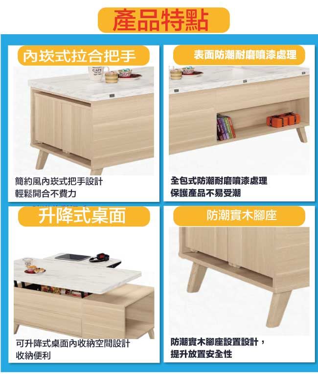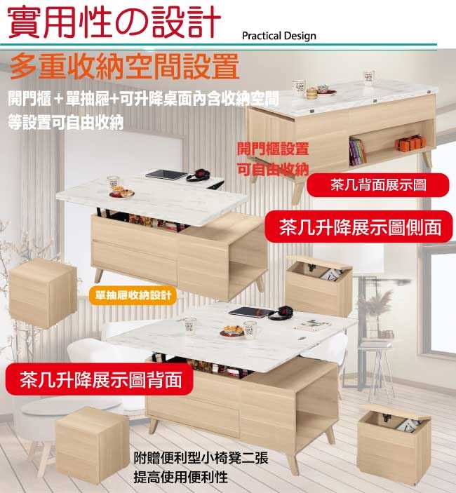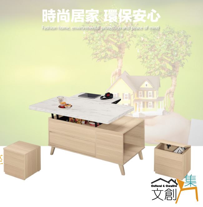 商 品 介 紹 | 【綠家居】蘿莎莉4尺可升降機能性大茶几(附收納椅凳二張) 木紋雙色系+現代簡約風格+安心材質製造,整體採用防蛀木心板+防潮耐磨腳座+五金滑軌結構+12mm高硬度岩板等安心材質製造,產品外層採用防潮耐磨噴漆處理搭配採用開門櫃+單抽屜+桌面可升降(52-69.5cm)+內&外開放式收納等收納空間設計,全由專人配送到家,專業安心服務,替你省下更多時間! 【商品特色】 木紋雙色系+現代簡約風格+安心材質製造,使用放心+搭配居家更便利 採用防蛀木心板+防潮耐磨腳座+五金滑軌結構+12mm高硬度岩板等安心材質製造 產品外層採用防潮耐磨噴漆處理 搭配採用開門櫃+單抽屜+桌面可升降(52-69.5cm)+內&外開放式收納等收納空間設計 此商品不需要DIY組立,此商品為組立後之成品 品質保證、專業設計、貼心服務 全由專人配送到家,專業安心服務,替您省下更多時間