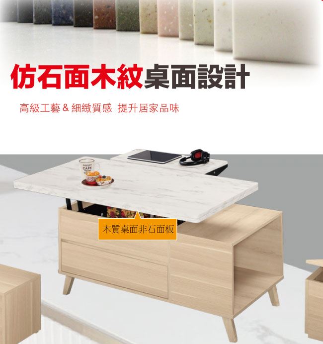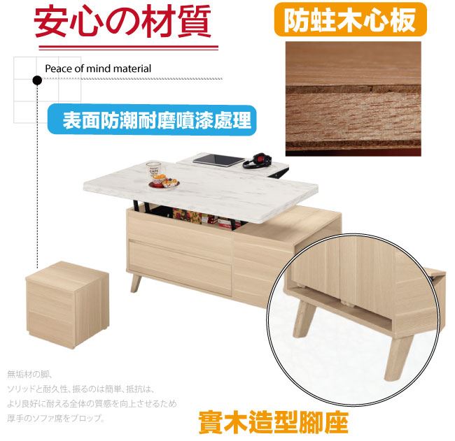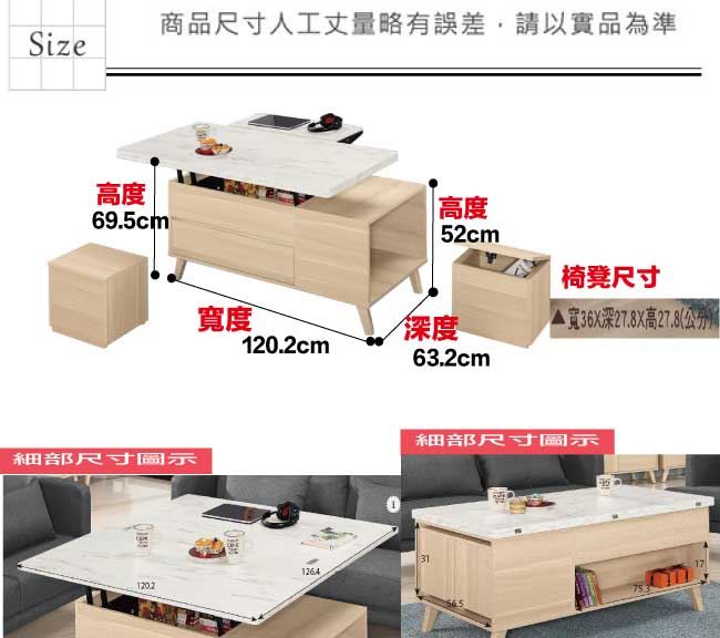 材質 | ◆產品名稱:【綠家居】蘿莎莉4尺可升降機能性大茶几(附收納椅凳二張) 尺寸:(寬)120.2x(深)63.2(高)52-69.5公分 ◆材質: 材質:防蛀木心板+防潮耐磨腳座+五金滑軌結構+12mm高硬度岩板 噴漆:防潮耐磨噴漆處理