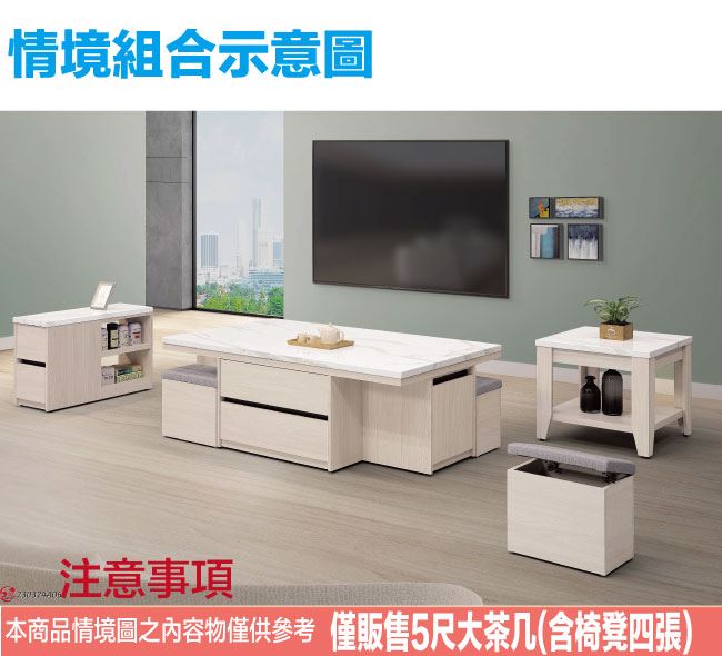 【綠家居】麥森5尺開門四抽大茶几(附收納椅凳四張)