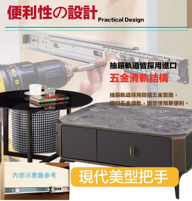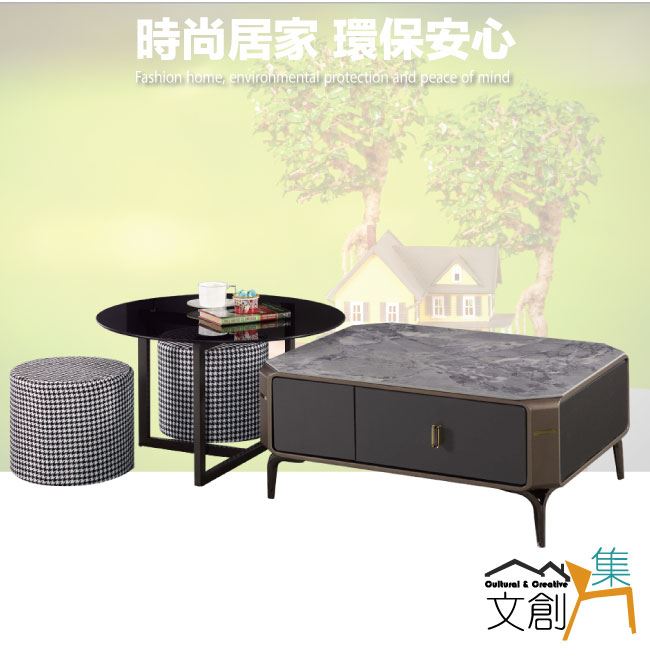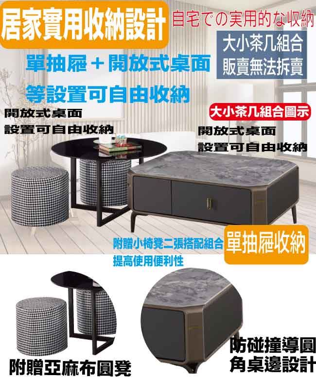商 品 介 紹 | 【綠家居】西凱2.7尺岩板二抽大小茶几/套几組合(附贈時尚千鳥紋布椅凳一張) 英倫雙色系+現代簡約風格+安心材質製造,使用放心+搭配居家更便利,整體採用防潮MDF纖維板(亮面漆)+防鏽黑漆五金腳座+五金滑軌結構+8mm高硬度岩板桌面板等材質搭配外層採用優莉坦亮面全包式噴漆處理 ,採用雙面開合二抽屜+開放式空間等收納空間設計,全由專人配送到家,專業安心服務,替你省下更多時間! 【商品特色】 英倫雙色系+現代簡約風格+安心材質製造,使用放心+搭配居家更便利 大小茶几組合系列,可組合擺設或是拉開陳設使用,超值加贈時尚千鳥紋布椅凳可自由擺設使用,增加居家實用性(本組茶几恕不拆賣) 防潮MDF纖維板(亮面漆)+防鏽黑漆五金腳座+五金滑軌結構+8mm高硬度岩板桌面板等材質 採用雙面開合二抽屜+開放式空間等收納空間設計 此商品不需要DIY組立,此商品為組立後之成品 品質保證、專業設計、貼心服務 全由專人配送到家,專業安心服務,替您省下更多時間