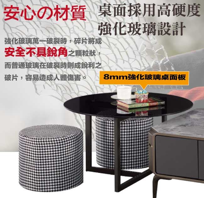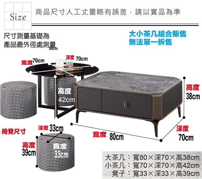 材質 | ◆產品名稱:【綠家居】凱雅特5尺岩板&玻璃大小茶几/套几組合(附贈時尚千鳥紋布椅凳二張) 大茶几尺寸:(寬)80x(深)70(高)38/公分 小茶几尺寸:(寬)70x(深)70(高)42/公分 套几尺寸:(寬)150x(深)70(高)42/公分 ◆材質: 材質:防潮MDF纖維板(亮面漆)+防鏽電鍍五金腳座+五金滑軌結構+6mm高硬度岩板桌面板+8mm強化玻璃桌面 噴漆:防潮亮面噴漆處理