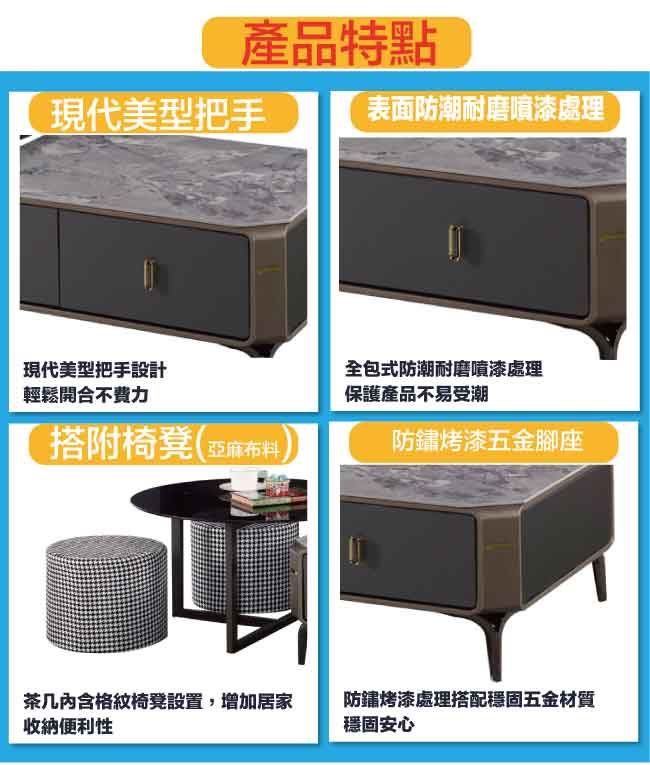 【綠家居】凱雅特5尺岩板&玻璃大小茶几/套几組合(附贈時尚千鳥紋布椅凳二張)