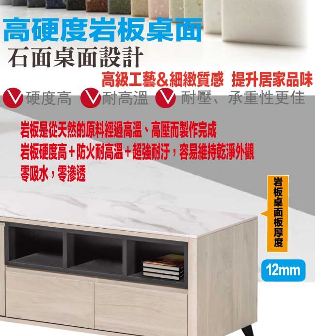 材質 | ◆產品名稱:【綠家居】麥里安4尺岩板單門二抽大茶几 尺寸:(寬)120x(深)60(高)54.5/公分 ◆材質: 材質:防蛀木心板+防潮黑漆腳座+五金滑軌結構+12mm高硬度岩板桌面板 噴漆:防潮耐磨噴漆處理