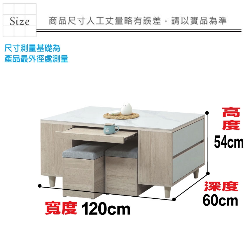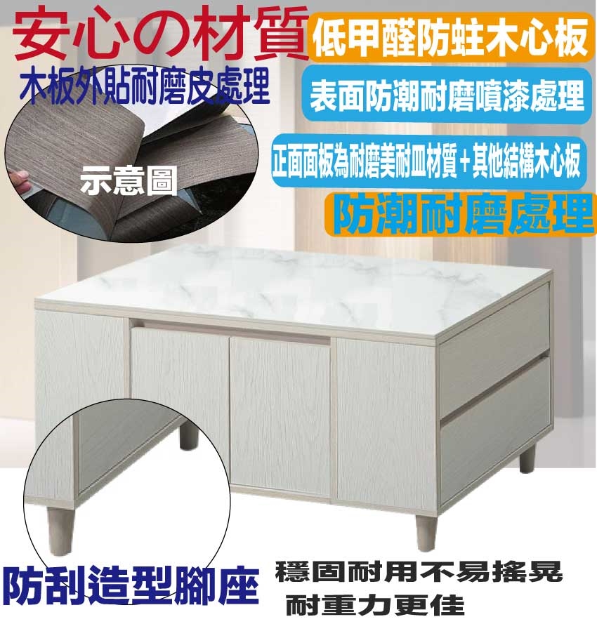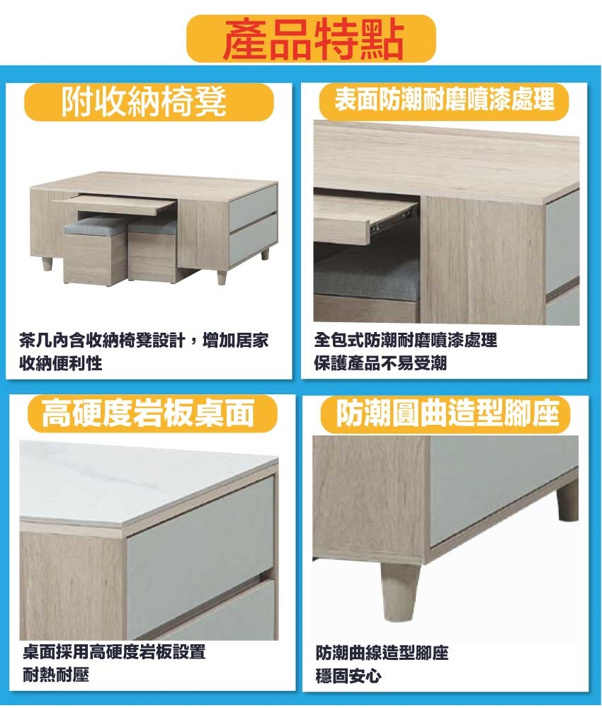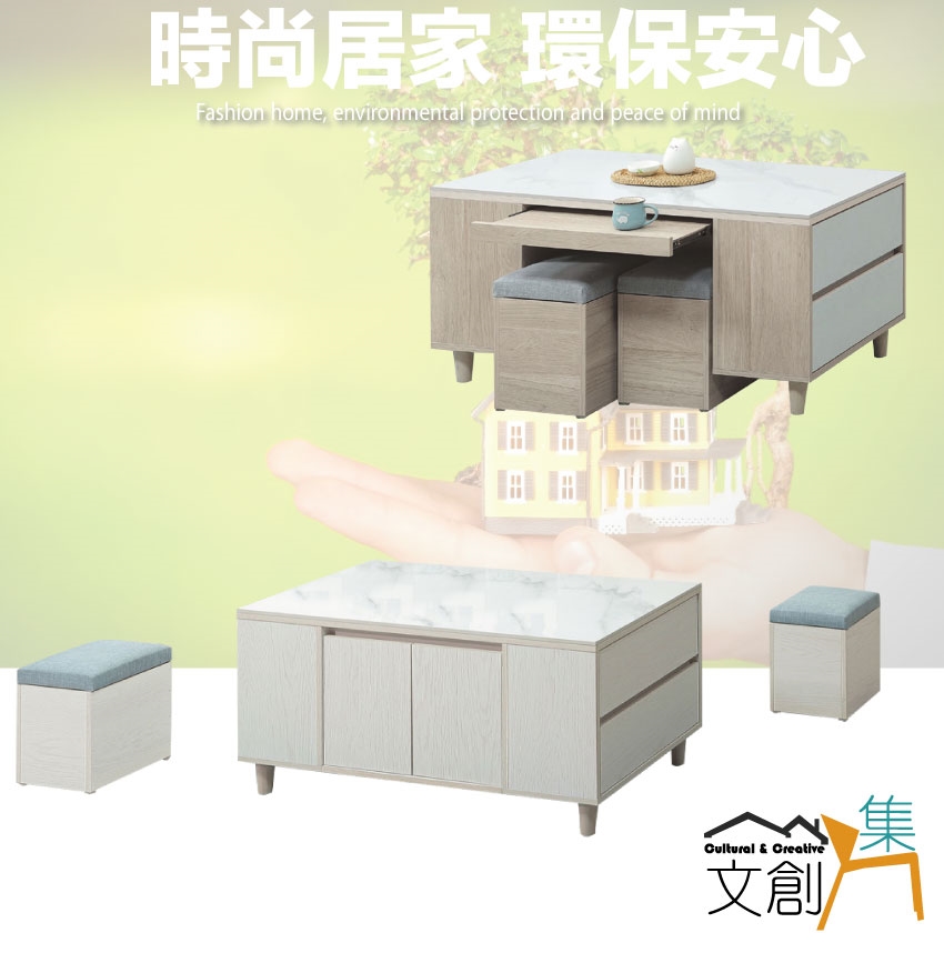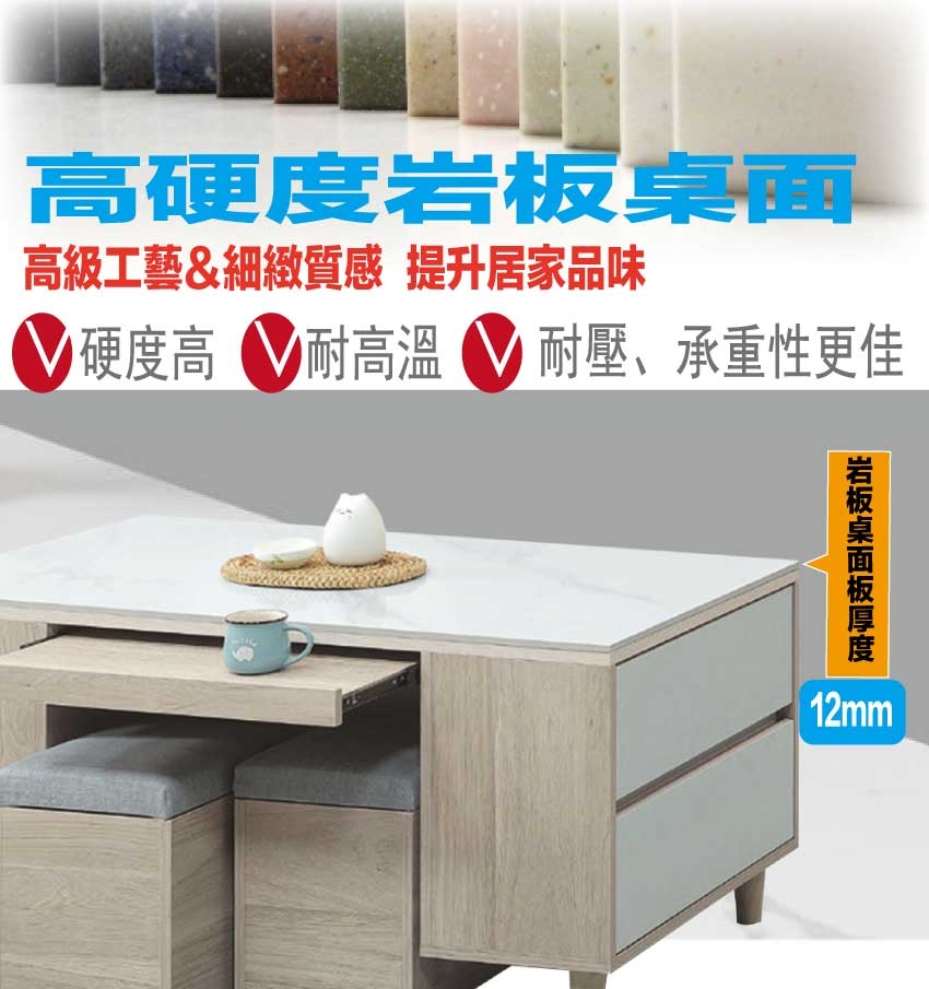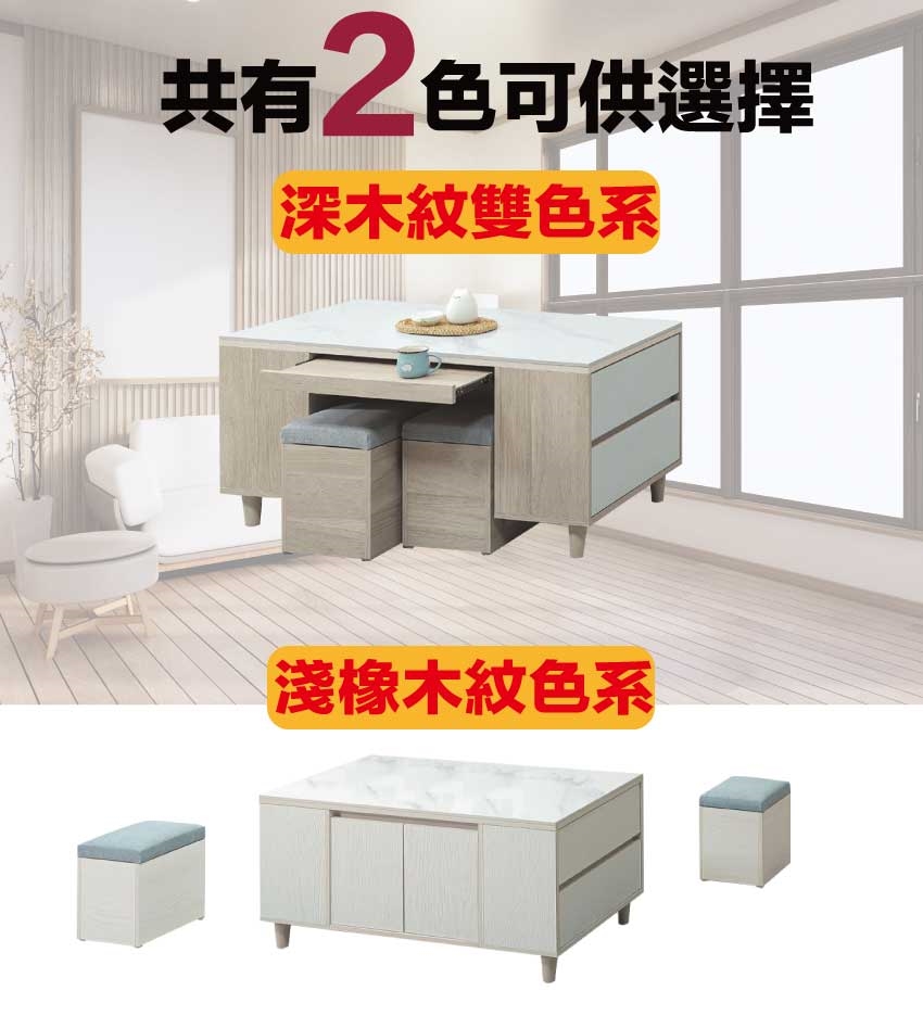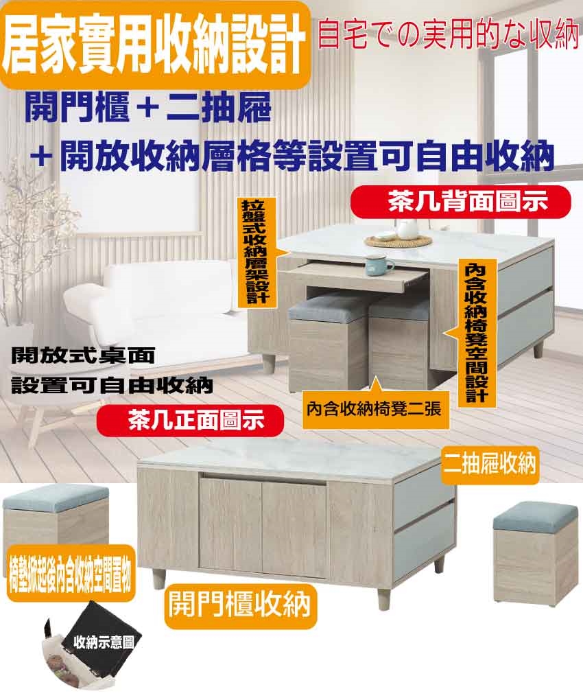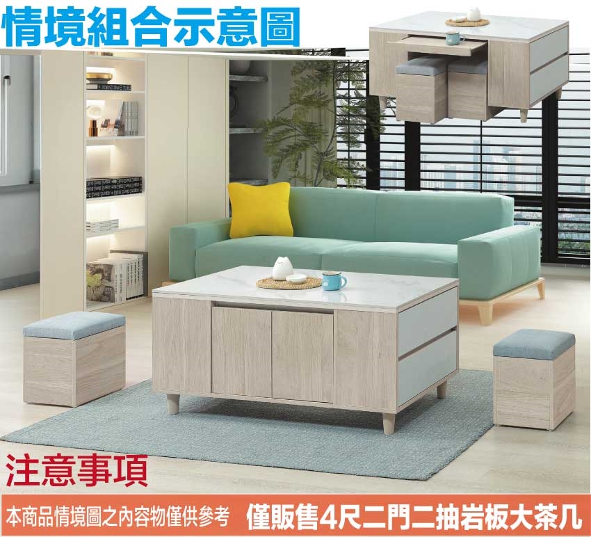 - ◆產品名稱:【綠家居】盧班岩板4尺二門二抽大茶几(二色可選+附收納椅凳二張)
