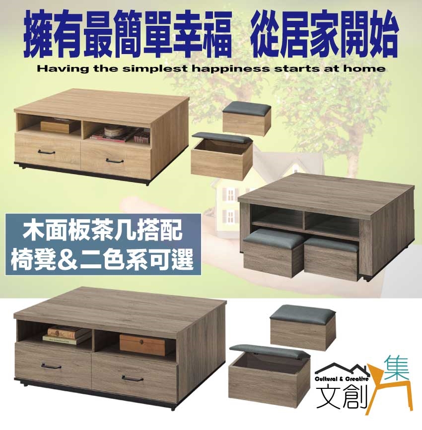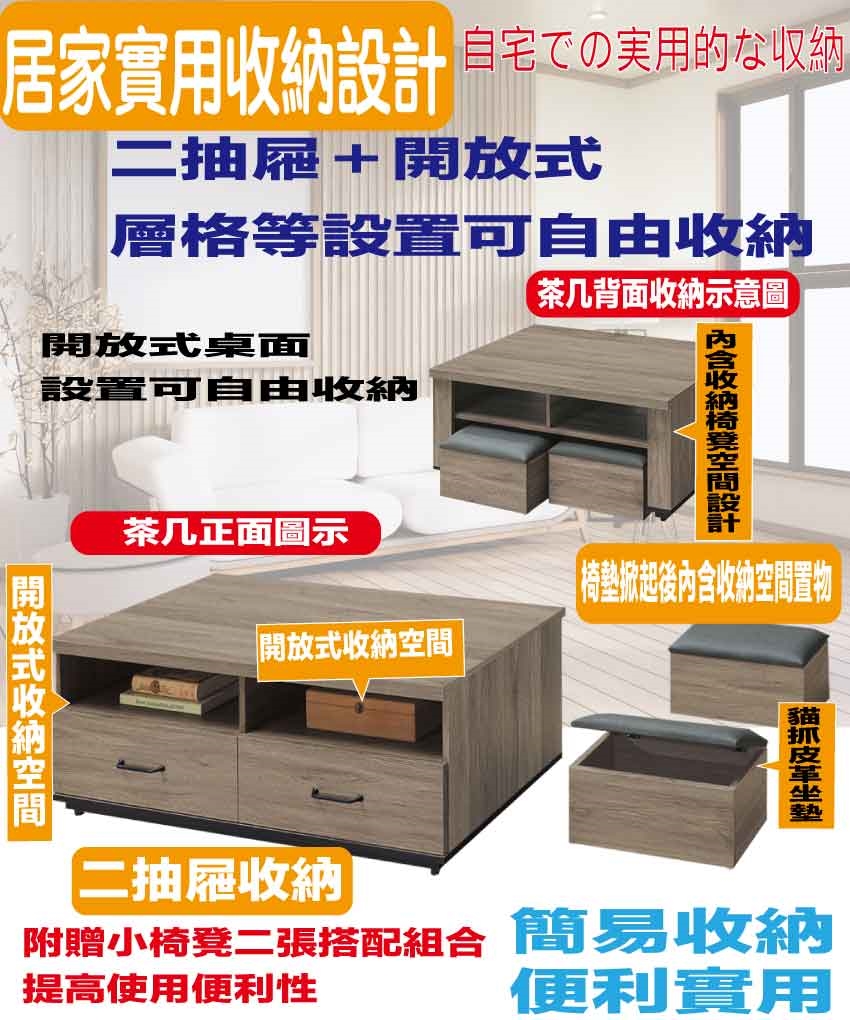 茶几另外附贈可收納椅凳二張,讓空間更多彈性利用空間