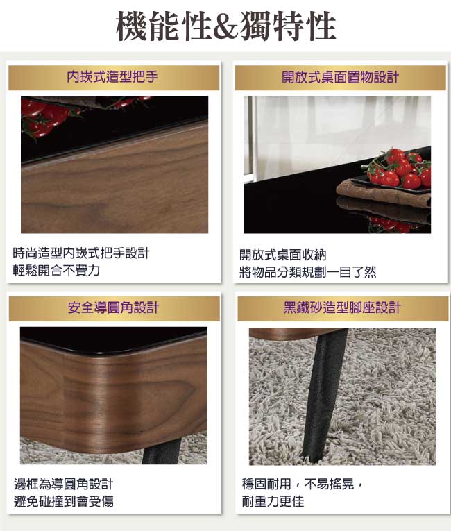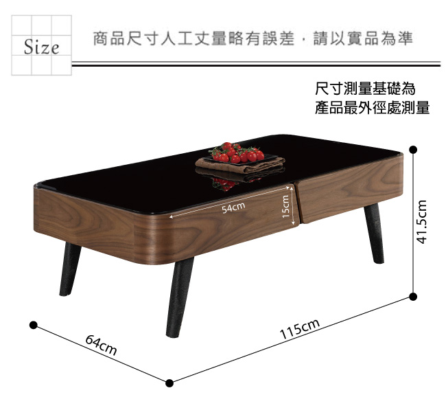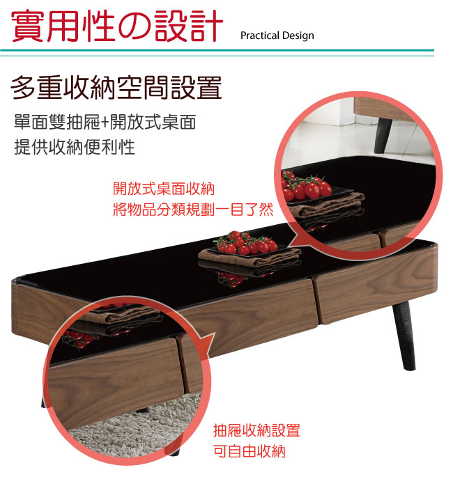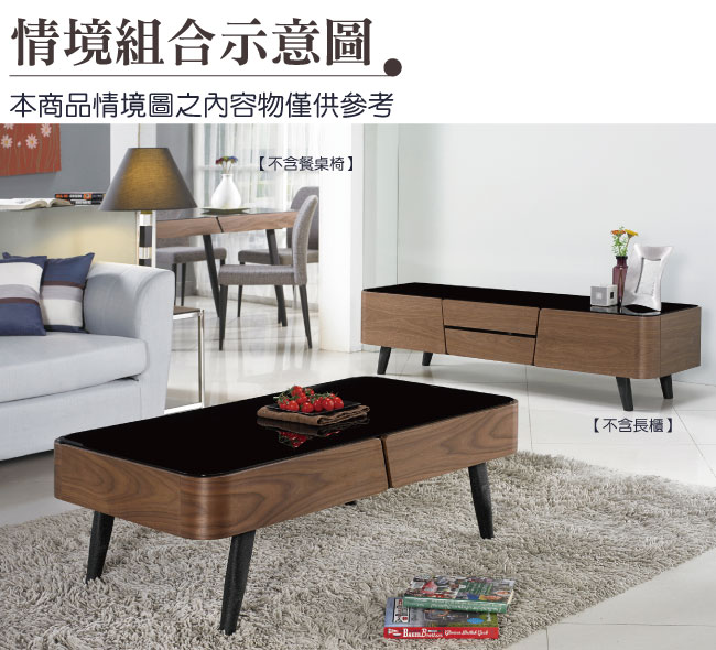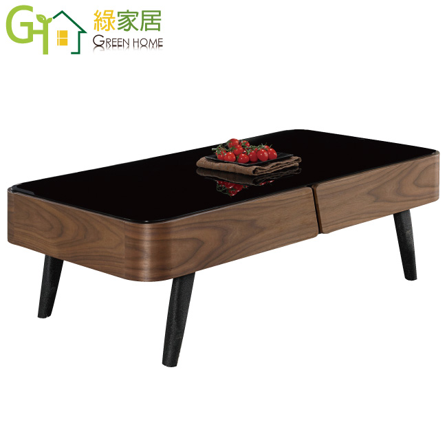【綠家居】艾妮 時尚3.8尺木紋黑玻大茶几 以低調的流線線條設計+黑鐵砂金屬腳座++5mm高硬度強化玻璃+防潮MDF材質+優利坦三層全包式塗漆塗裝處理等材質製作,讓您使用防潮防蛀更安心,耐用牢固承重量高。茶几採用二抽屜收納設計,另外內崁式把手設計更增加居家質感。搭配鋼珠滑軌+側邊導圓角等安全性結構,滑順好開,操作變得容易自如,使用不費力照料您的生活。客廳擺設也可以很時尚,搭配居家擺設更顯主人品味和氣質展現。