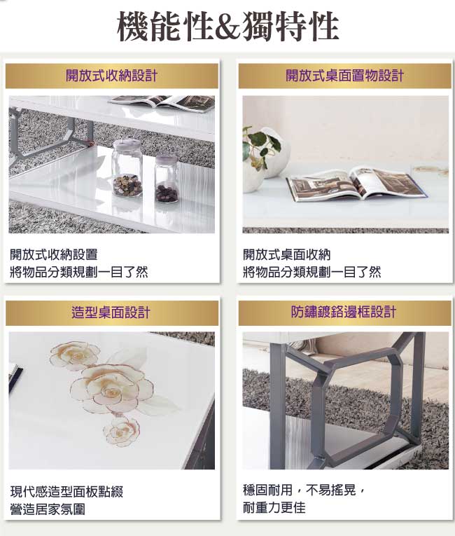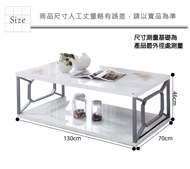 產品名稱:【綠家居】卡特 時尚白4.3尺玻璃大茶几 產品尺寸:(寬)130x (深)70x (高)46 公分 產品材質: 材質:防潮MDF板材 塗裝:優利坦抗磨三層全包式塗漆塗裝 邊框:防鏽鍍烙邊框 玻璃:12mm高硬度強化玻璃商品編號 | 尺寸 | 顏色 | 組裝方式 |
