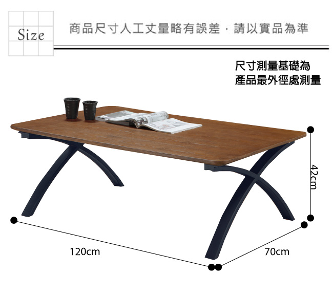 產品名稱:【綠家居】佐恩 時尚4尺胡桃木紋大茶几 產品尺寸:(寬)120x (深)70x (高)42公分 產品材質: 材質:防潮MDF板材 塗裝:優利坦抗磨三層全包式塗漆塗裝 腳座:黑鐵砂金屬腳座 商品編號 | 尺寸 | 顏色 | 組裝方式 |