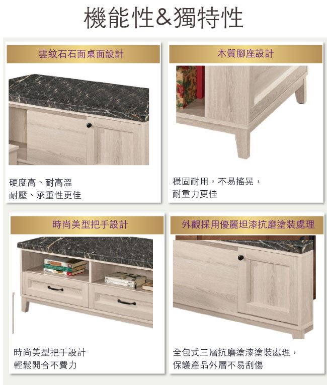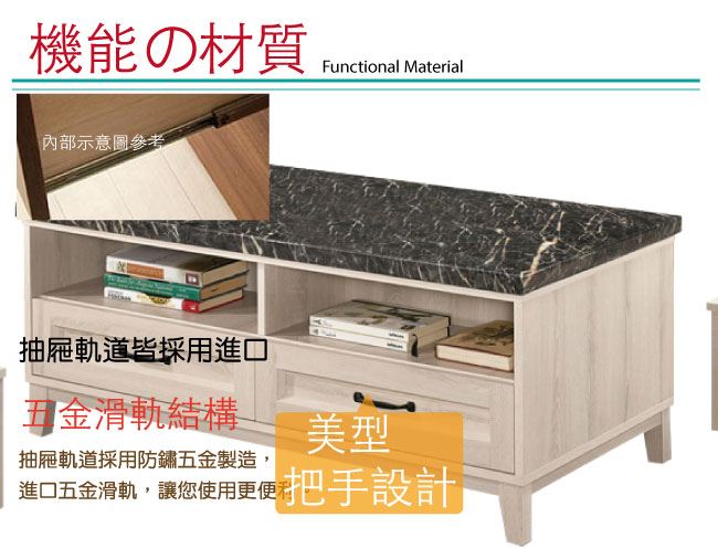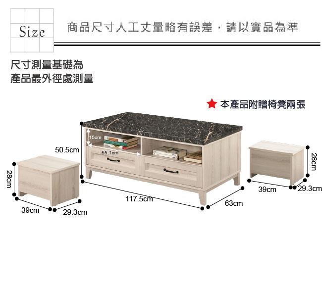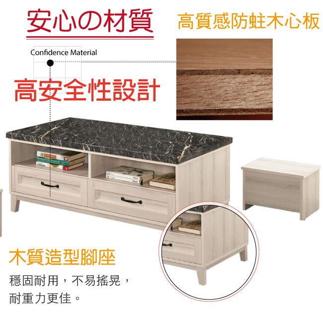 材質 | ◆產品名稱: 【綠家居】班特 時尚3.9尺雲紋石面大茶几(附收納椅凳二張) 尺寸:(寬)117.5x(深)63x(高)50.5/公分 ◆材質: 材質:防蛀木心板+防潮木質腳座+五金滑軌結構+2cm雲紋石面板 噴漆:防潮耐磨噴漆處理