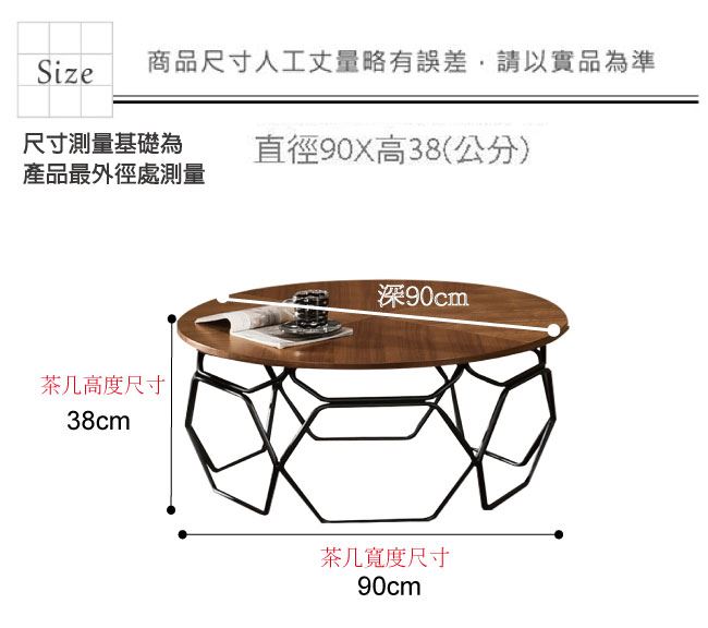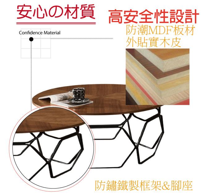材質 | ◆產品名稱: 【綠家居】傑安 幾何風3尺雙色大茶几/大圓几 產品尺寸: 尺寸:(寬)90x(深)90x(高)38/公分 材質:防鏽鐵製框架&腳座+防潮MDF板外貼實木皮