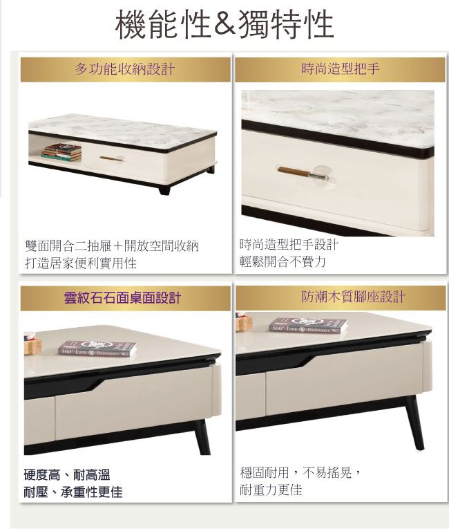 材質 | ◆產品名稱: 【綠家居】貝蒙 典雅白4尺雲紋石面二抽大茶几 產品尺寸: 尺寸:(寬)120x(深)60x(高)44/公分 材質:防潮MDF板材+五金滑軌結構+防潮實木腳座+12mm雲紋石面桌面板 塗漆:外層採用優莉坦亮面噴漆處理