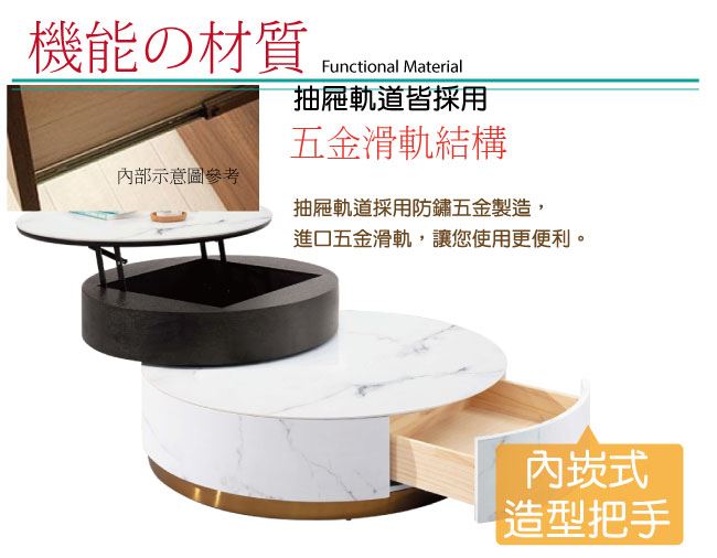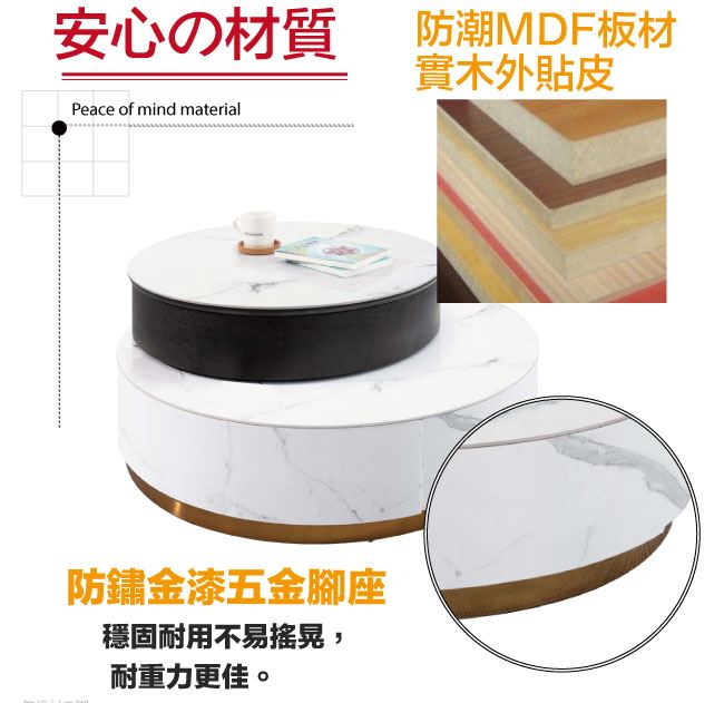材質 | ◆產品名稱:【綠家居】聖多美雙色3尺岩板旋轉升降機能大茶几/大圓几組合 尺寸:(寬)90-117x(深)90(高)41-53公分 雙桌面可伸縮使用,不可分開使用 小茶几桌面可升降開合 ◆材質: 材質:防潮MDF板材(抽屜採用實木板材)+防鏽金漆五金腳座+五金滑軌結構+6mm高硬度岩板 噴漆:防潮亮面&耐磨噴漆處理