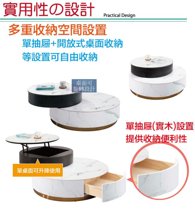 商 品 介 紹 | 【綠家居】聖多美雙色3尺岩板旋轉升降機能大茶几/大圓几組合 雲紋白雙色系+現代簡約風格+安心材質製造,整體採用防潮MDF板材(抽屜採用實木板材)+防潮金漆腳座+五金滑軌結構+6mm高硬度岩板等安心材質製造,產品外層採用雙桌面可旋轉展開使用+桌面可升降內含收納層格+單抽屜+開放式收納等收納空間設計,全由專人配送到家,專業安心服務,替你省下更多時間! 【商品特色】 雲紋白雙色系+現代簡約風格+安心材質製造,使用放心+搭配居家更便利 採用防潮MDF板材(抽屜採用實木板材)+防潮金漆腳座+五金滑軌結構+6mm高硬度岩板等安心材質製造 產品外層採用防潮亮面噴漆處理 搭配採用雙桌面可旋轉展開使用+桌面可升降內含收納層格+單抽屜+開放式收納等收納空間設計 此商品不需要DIY組立,此商品為組立後之成品 品質保證、專業設計、貼心服務 全由專人配送到家,專業安心服務,替您省下更多時間