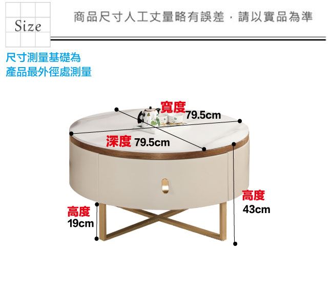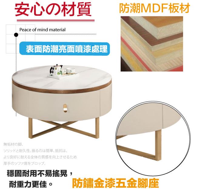 材質 | ◆產品名稱:【綠家居】瑪西卡2.7尺岩板大茶几/圓几 大茶几尺寸:(寬)79.5x(深)79.5(高)43公分 ◆材質: 材質:防潮MDF板材+防鏽金漆五金腳座+五金滑軌結構+12mm高硬度岩板桌面板 噴漆:防潮亮面噴漆處理