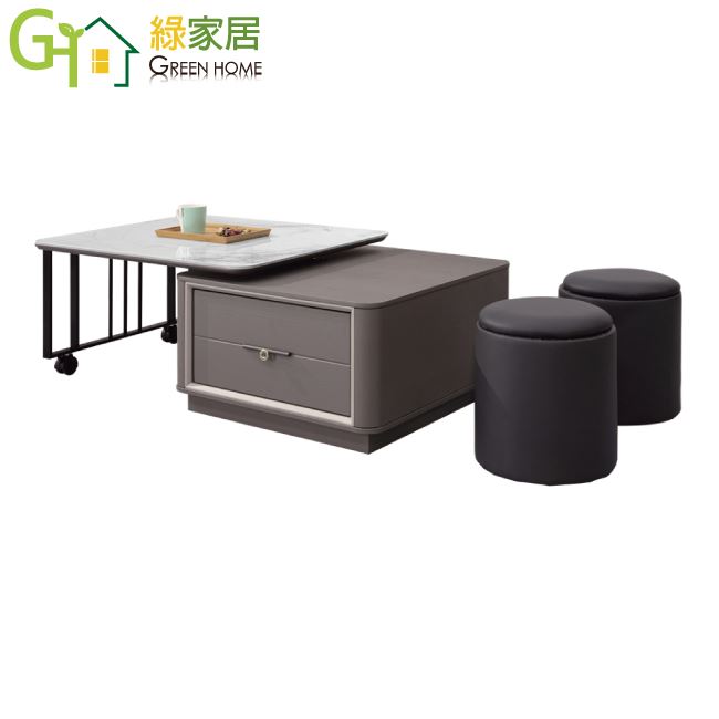 【綠家居】杰尼莎2.7尺岩板旋轉大茶几組合(桌面可旋轉展開+附贈皮革椅凳二張)