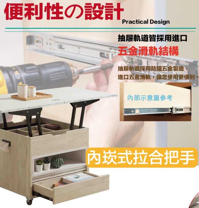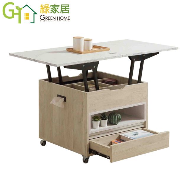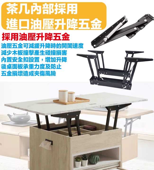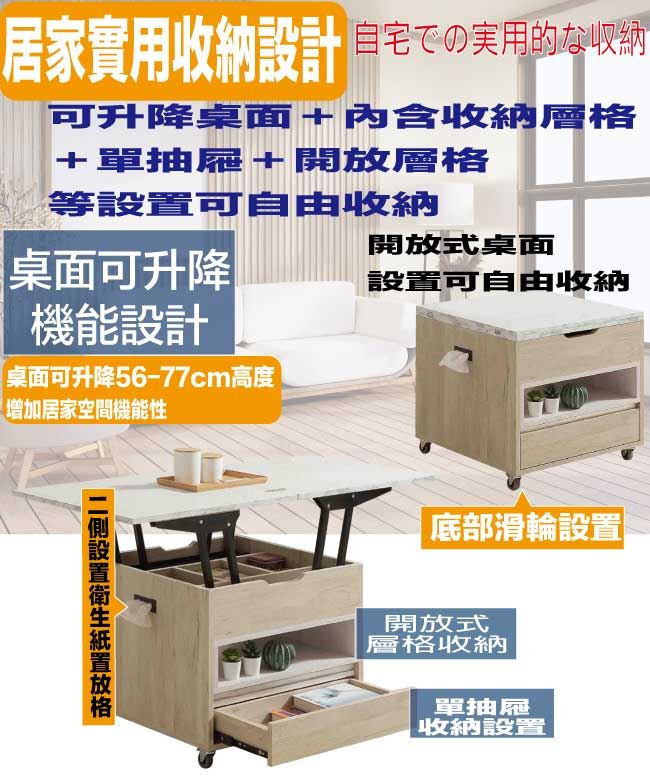 商 品 介 紹 | 【綠家居】維爾4尺升降機能大茶几(附贈可收納椅凳二張) 木紋雙色系+現代簡約風格+安心材質製造,整體採用防蛀木心板+仿石紋美耐皿桌面板+五金滑軌結構&升降五金結構+活動式滑輪設置等安心材質製造,產品外層採用防潮亮面噴漆處理搭配採用單抽屜+開放&隱藏式收納等收納空間設計,全由專人配送到家,專業安心服務,替你省下更多時間! 【商品特色】 木紋雙色系+現代簡約風格+安心材質製造,使用放心+搭配居家更便利 茶几桌面板可升降設計,讓您可依據實際使用狀況調整高度及桌面寬度,提升居家便利性 採用防蛀木心板+活動式滑輪設置+仿石紋美耐皿桌面板+五金滑軌結構&升降五金結構等安心材質製造 搭配採用單抽屜+開放&隱藏式收納等收納空間設計 此商品不需要DIY組立,此商品為組立後之成品 品質保證、專業設計、貼心服務 全由專人配送到家,專業安心服務,替您省下更多時間