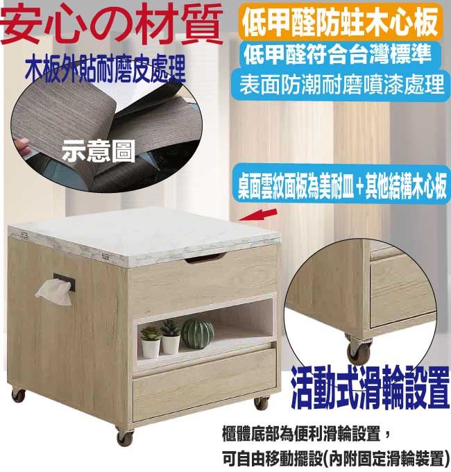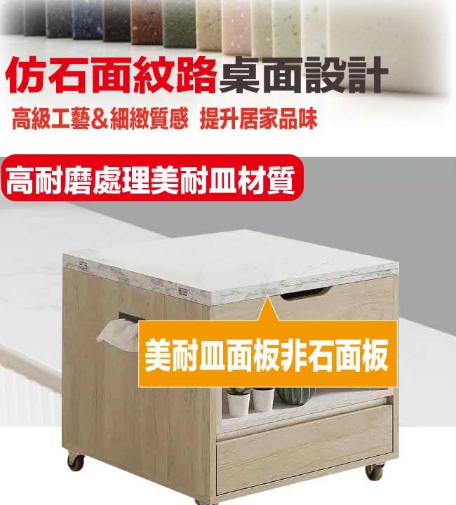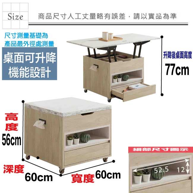 材質 | ◆產品名稱:【綠家居】愛坦2尺升降機能小茶几(底部滑輪可移動擺設) 尺寸:(寬)60x(深)60-60(高)56-77/公分 ◆材質: 材質:防蛀木心板+仿石紋美耐皿桌面板+五金滑軌結構&升降五金結構+活動式滑輪設置 表面防潮耐磨噴漆處理 |