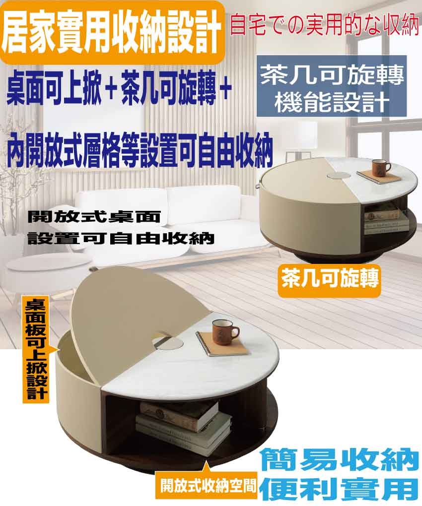 搭配採用可上掀桌面板+內&外開放層格+茶几可旋轉機能等收納空間設計