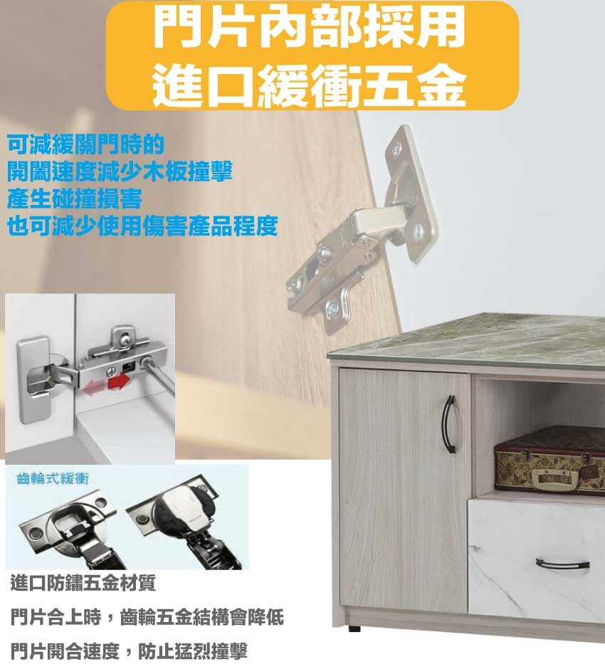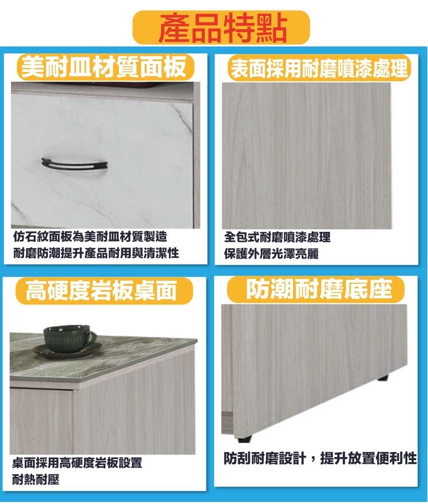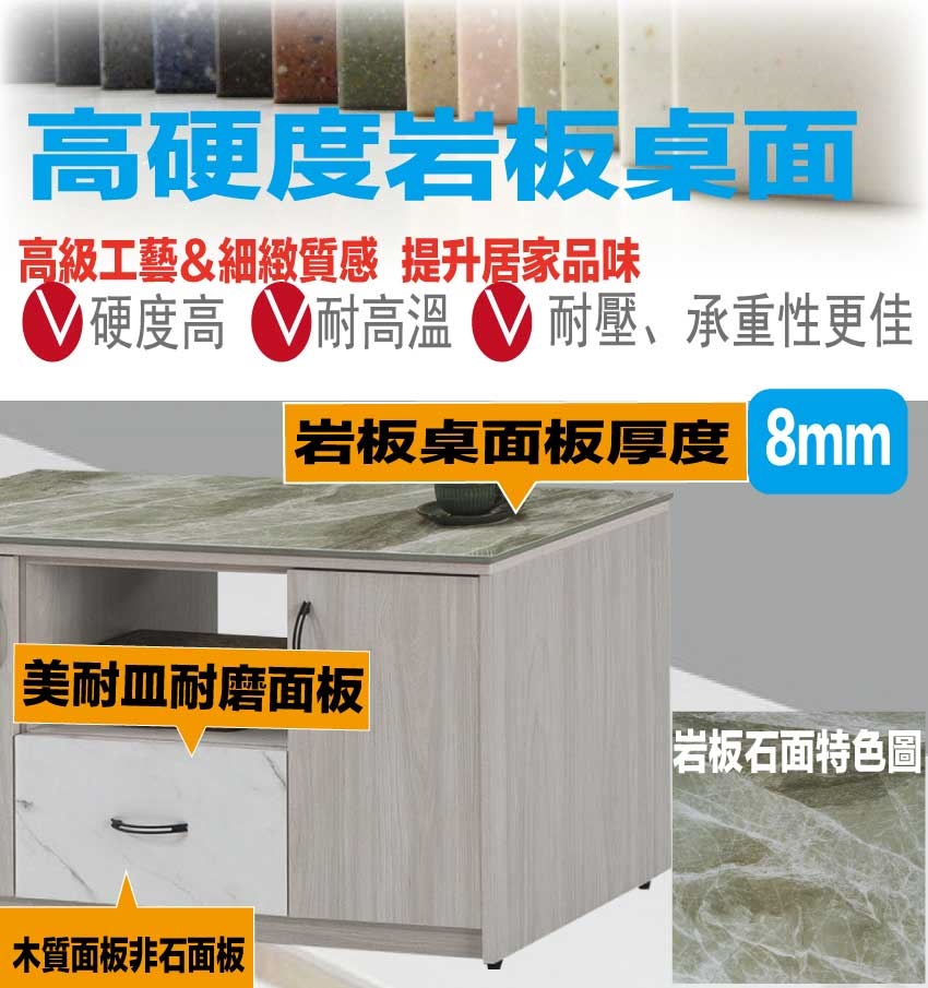 材質:防蛀木心板+防潮耐磨底座(可調高低水平)+仿大理石紋路耐磨美耐皿面板+防夾手緩衝門片五金+8mm高硬度岩板桌面板 -