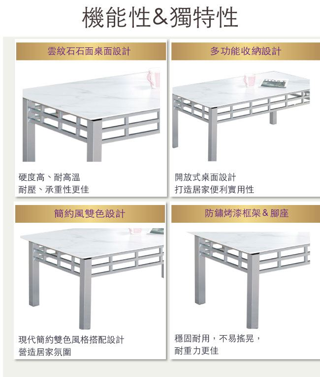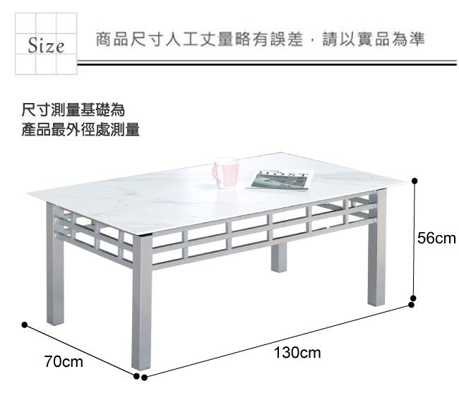 材質 | ◆產品名稱:【綠家居】 赫拉 時尚銀4.3尺雲紋石面大茶几 尺寸:(寬)130x(深)70x(高)56/公分 ◆材質: 材質:防鏽烤漆框架&腳座+12mm雲紋石面板 |