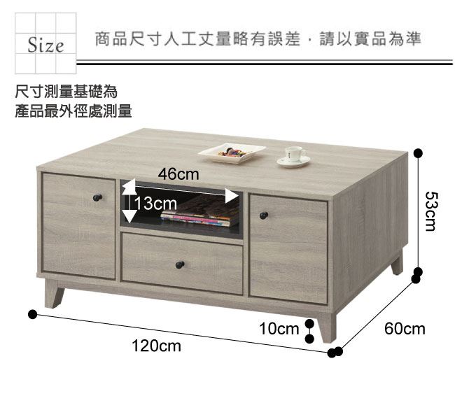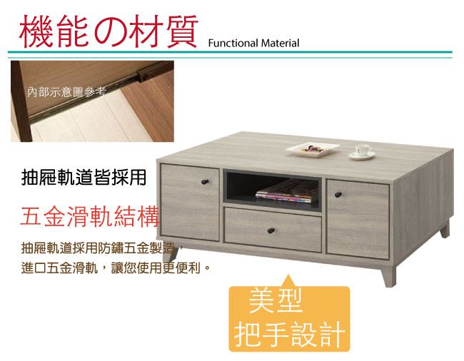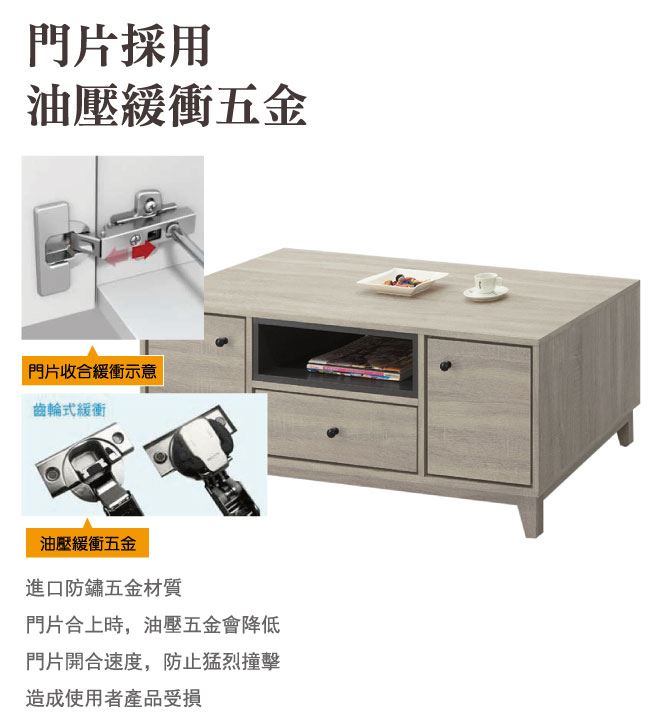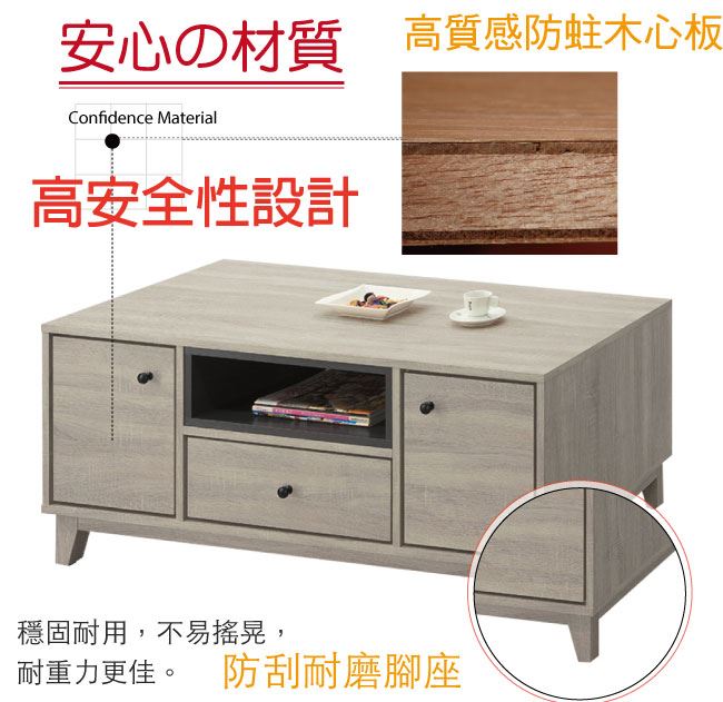 材質 | ◆產品名稱: 【綠家居】約納 時尚4尺二門單抽大茶几 尺寸:(寬)120x(深)60x(高)53/公分 ◆材質: 材質:防蛀木心板+五金滑軌結構+防潮耐磨底座+防夾手緩衝門片五金