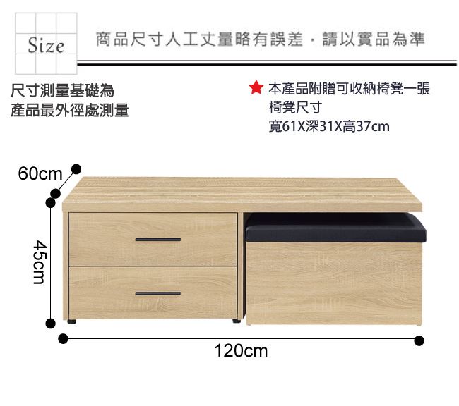 尺寸:(寬)120x(深)60(高)45公分 ◆材質: 材質:防蛀木心板+防潮耐磨腳座+五金滑軌結構 噴漆:防潮耐磨噴漆處理