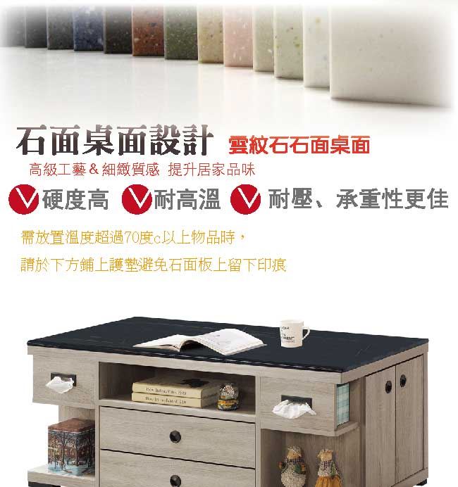 商 品 介 紹 | 【綠家居】凱葳雲紋石面4尺五抽二門大茶几(內附二張椅凳) 淺橡木紋色系+現代簡約風格+安心材質製造,整體採用防蛀木心板+防潮黑漆腳座+五金滑軌結構+12mm雲紋石面等安心材質製造,產品外層採用防潮耐磨噴漆處理搭配採用開門櫃+五抽屜(正面二抽+側邊開三抽)+面紙收納抽格+開放式收納+內附二張椅凳等空間設計,全由專人配送到家,專業安心服務,替你省下更多時間! 【商品特色】 淺橡木紋色系+現代簡約風格+安心材質製造,使用放心+搭配居家更便利 採用防蛀木心板+防潮黑漆腳座+五金滑軌結構+12mm雲紋石面等安心材質製造 產品外層採用防潮耐磨噴漆處理 搭配採用開門櫃+五抽屜(正面二抽+側邊開三抽)+面紙收納抽格+開放式收納+內附二張椅凳等空間設計 此商品不需要DIY組立,此商品為組立後之成品 全由專人配送到家,專業安心服務,替您省下更多時間 |