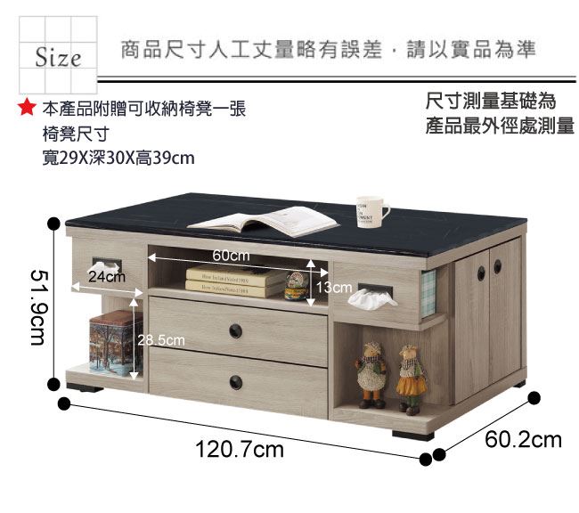尺寸:(寬)120.7x(深)60.2(高)51.9公分 ◆材質: 材質:防蛀木心板+防潮黑漆腳座+五金滑軌結構+12mm雲紋石面 噴漆:防潮耐磨噴漆處理