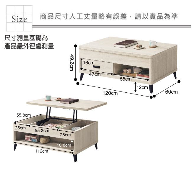 尺寸:(寬)120x(深)60(高)49.2公分 ◆材質: 材質:防蛀木心板+防鏽黑漆腳座+五金滑軌結構+升降防鏽五金結構 噴漆:防潮耐磨噴漆處理