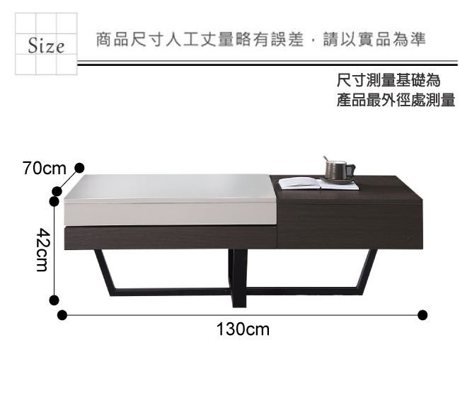 尺寸:(寬)130x(深)70(高)42公分 ◆材質: 材質:防蛀木心板+防潮MDF板材+防鏽黑漆腳座+五金滑軌結構 噴漆:防潮耐磨&亮面噴漆處理
