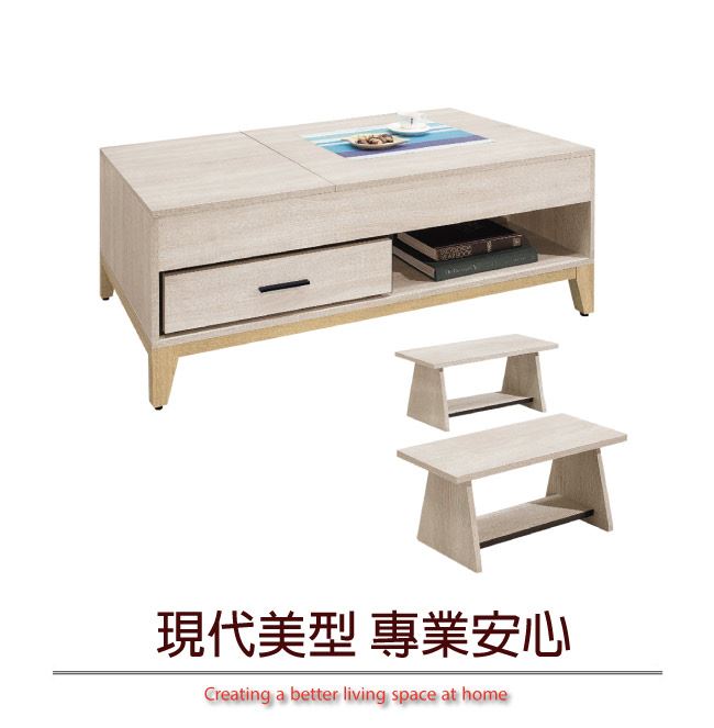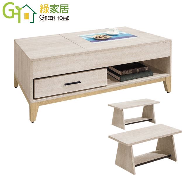 商 品 介 紹 | 【綠家居】格瑪奇4尺升降機能大茶几(二色可選+內附小椅凳二張) 淺橡木紋色系+現代簡約風格+安心材質製造,整體採用防蛀木心板+防潮耐磨腳座+五金滑軌結構+升降防鏽五金結構等安心材質製造,產品外層採用防潮耐磨噴漆處理搭配採用單抽屜+開放式收納+可升降式雙桌面板等空間設計,全由專人配送到家,專業安心服務,替你省下更多時間! 【商品特色】 淺橡木紋色系+現代簡約風格+安心材質製造,使用放心+搭配居家更便利 茶几雙桌面板可做49-72.5cm高度升降使用,內含可收納層格便利居家收納實用性 採用防蛀木心板+防潮耐磨腳座+五金滑軌結構+升降防鏽五金結構等安心材質製造 產品外層採用防潮耐磨噴漆處理 搭配採用單抽屜+開放式收納+可升降式雙桌面板等空間設計 此商品不需要DIY組立,此商品為組立後之成品 全由專人配送到家,專業安心服務,替您省下更多時間 |