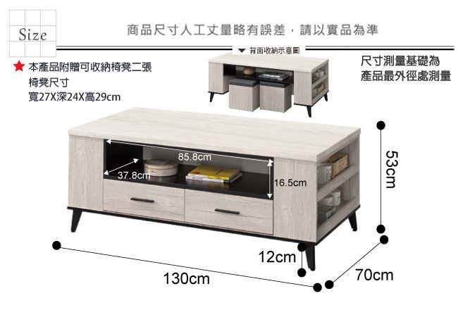 尺寸:(寬)130x(深)70(高)53公分 ◆材質: 材質:防蛀木心板+防鏽黑漆腳座+五金滑軌結構+2cm仿雲紋石面木質桌面板(非人造石面板) 噴漆:防潮耐磨噴漆處理