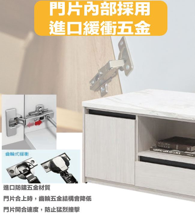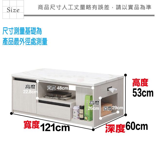 材質 | ◆產品名稱:【綠家居】卡奇里4尺白榆木紋開門單抽大茶几 尺寸:(寬)121x(深)60(高)53/公分 ◆材質: 材質:防蛀木心板+防潮MDF纖維板材(桌面板材質)+防潮耐磨腳座+五金滑軌結構+仿雲紋石面紋路木質桌面板+防夾手緩衝門片五金 噴漆:防潮耐磨噴漆處理 |