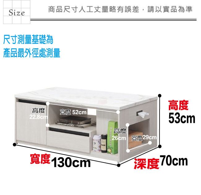 材質 | ◆產品名稱:【綠家居】卡奇里4.3尺白榆木紋雙面使用開門二抽大茶几 尺寸:(寬)130x(深)70(高)53/公分 ◆材質: 材質:防蛀木心板+防潮MDF纖維板材(桌面板材質)+防潮耐磨腳座+五金滑軌結構+仿雲紋石面紋路木質桌面板+防夾手緩衝門片五金 噴漆:防潮耐磨噴漆處理 |